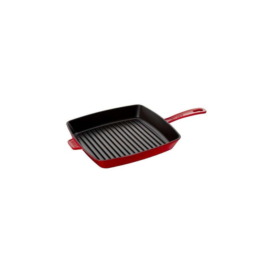 Bistecchiera "americana" in ghisa vetrificata dimensioni 30x 30. Disponibile in varianti colore, nero, grigio e rosso ciliegio. I bordi alti permettono la realizzazione di portate quali bocconcini di carne o cubetti di verdure inoltre evitano gli schizzi durante la cottura.