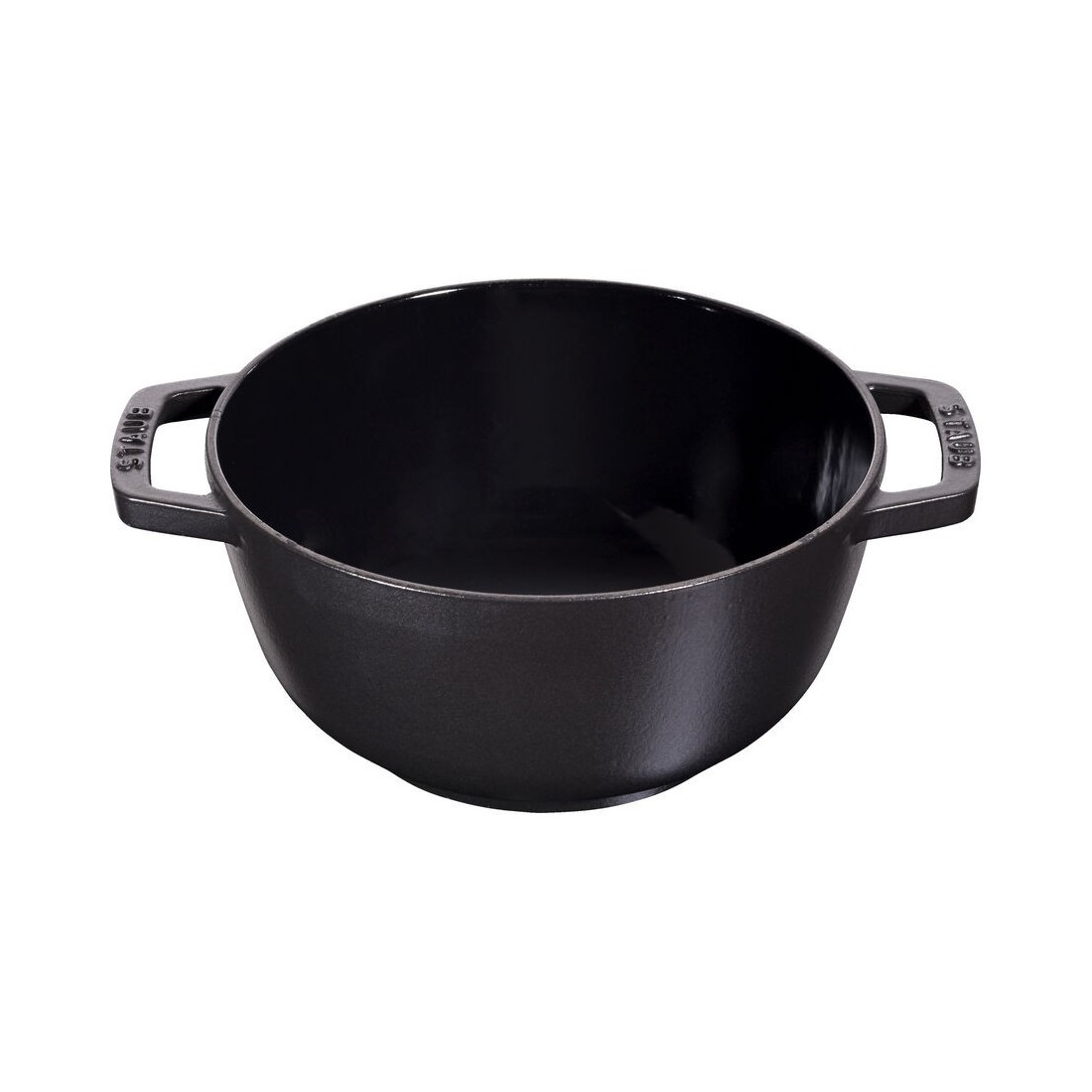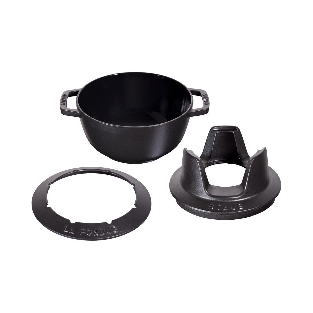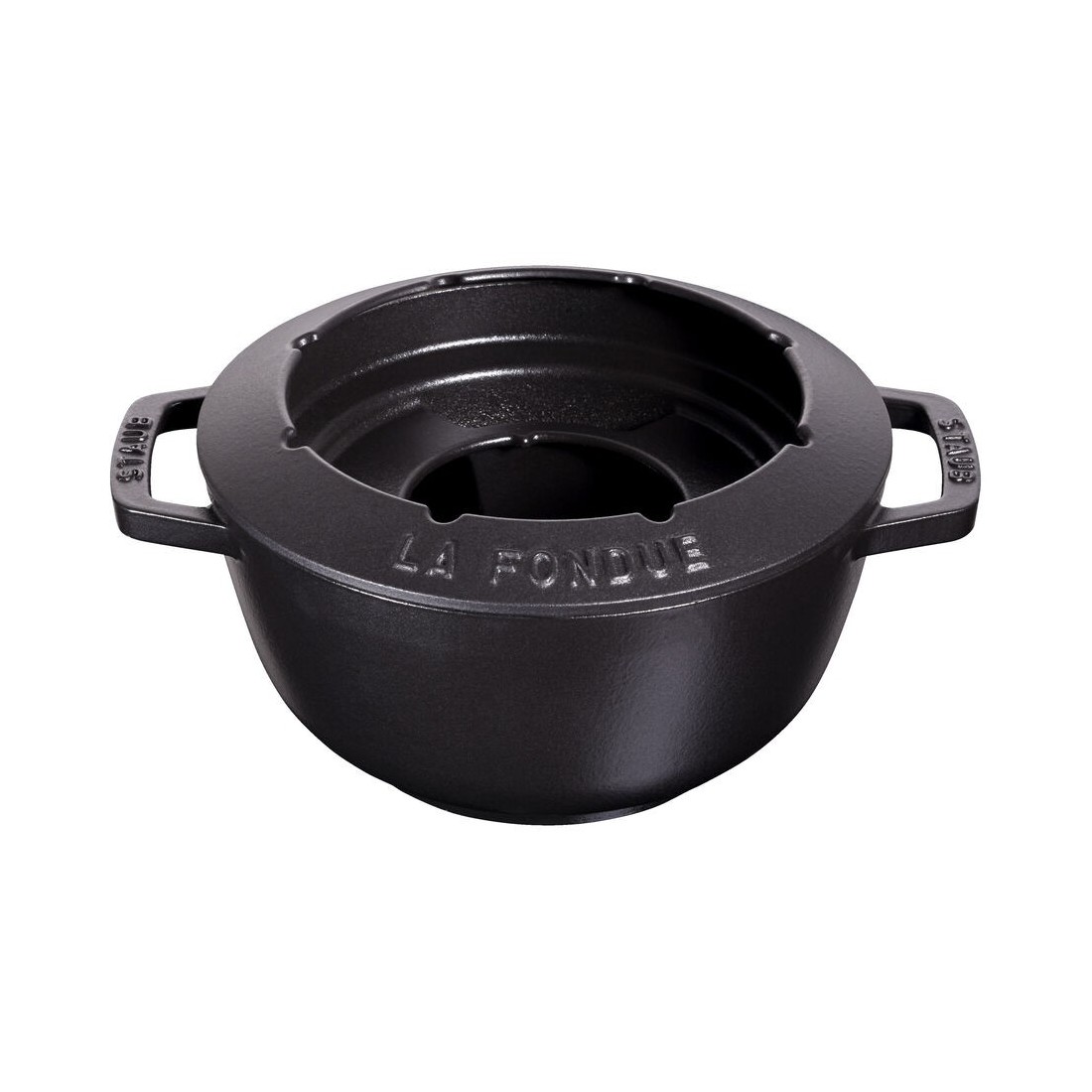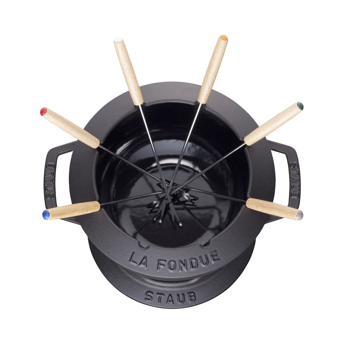Il set da fonduta è composto da una pentola dal diametro di 20 cm e una capacità di 2,3 l e un fornello, il quale, grazie al combustibile ( non in dotazione ) , mantiene caldo l’olio o il formaggio. Parte del set sono anche sei forchette da fonduta, adatte anche per un gruppo di persone più ristretto. Il set da fonduta, dopo l’utilizzo, può essere conservato in un pensile risparmiando spazio: basta posizionare il fornello all’interno della pentola. La pentola e il fornello del set da fonduta di STAUB sono realizzati in ghisa. Questo materiale è incredibilmente robusto e durevole. Inoltre, durante l’utilizzo, conserva bene il calore. L’estetica particolarmente raffinata è dovuta alla smaltatura. Questa, infatti, conferisce alla pentola un colore rosso ciliegia all’esterno, un color crema all’interno, mentre il fornello è di colore nero, generando così un piacevole contrasto visivo. Con questo set in ghisa di STAUB tu e i tuoi amici potrete gustarvi la fonduta realizzata nei modi più disparati.
