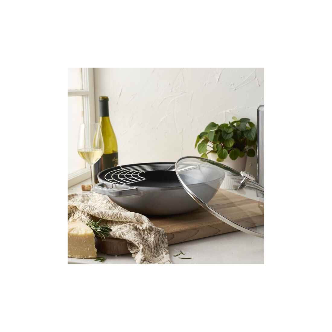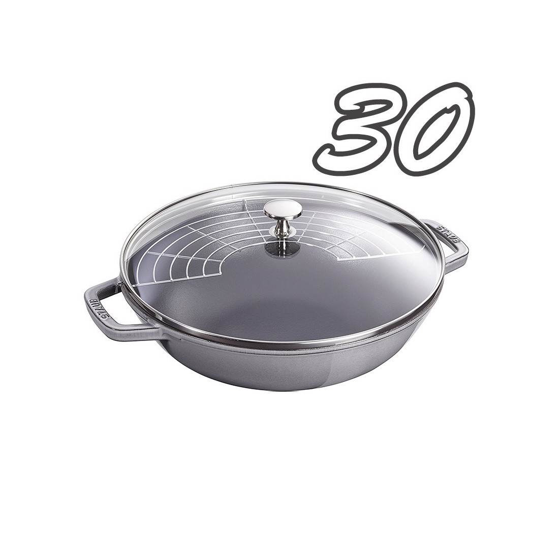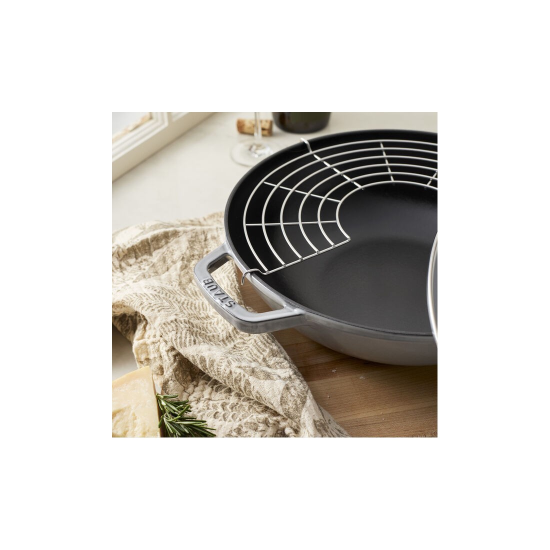 Wok 30 cm in ghisa smaltata Staub in finitura classica nero opaco con con griglia e coperchio in vetro. Ideale per preparazioni ispirate alla cucina asiatica e non solo, è perfetto per stufare, cuocere al vapore e friggere carne, pesce e verdure con risultati sempre uniformi.