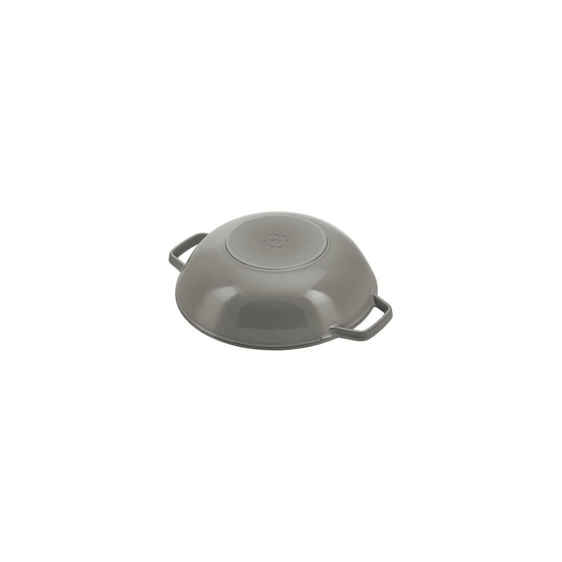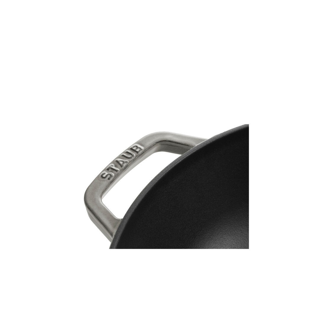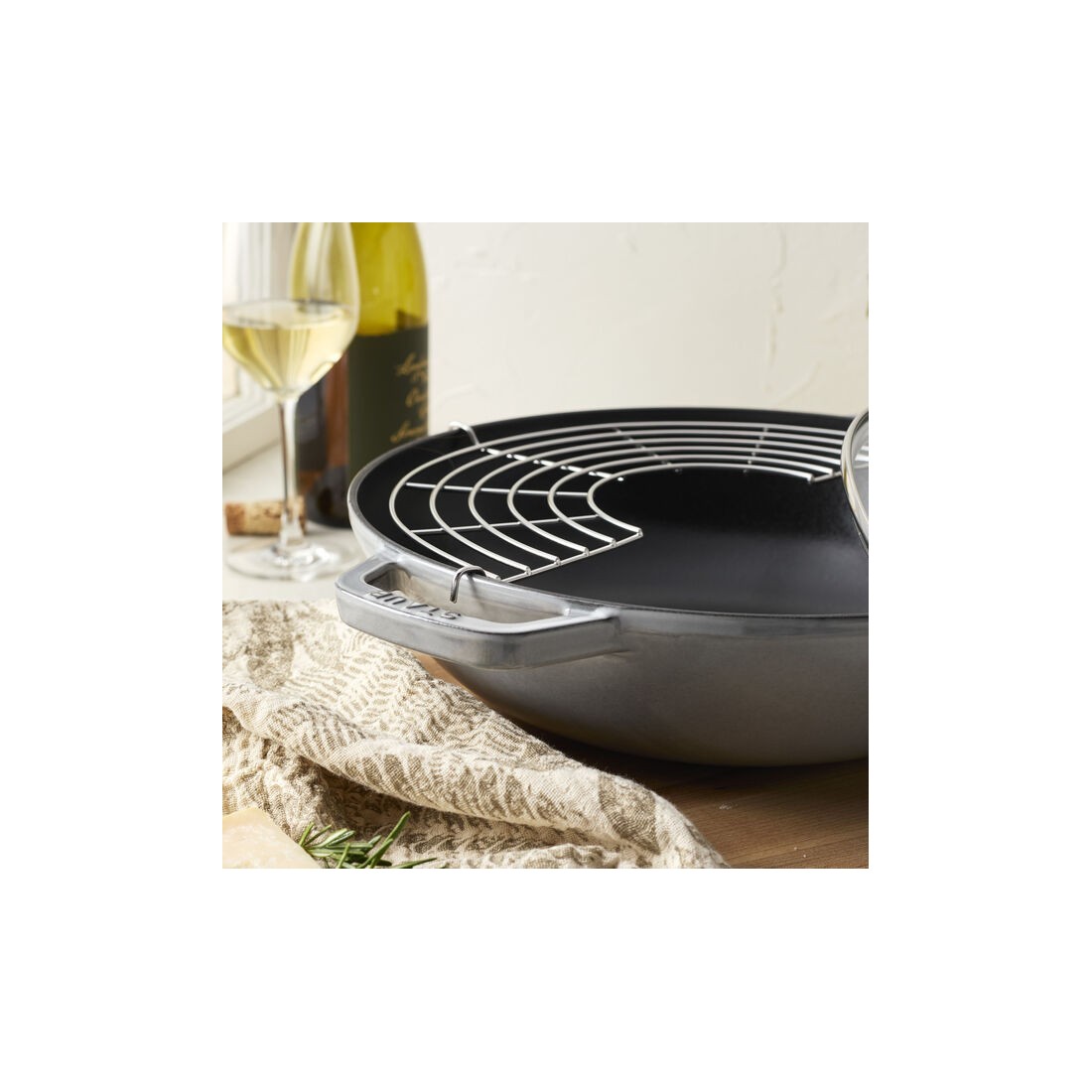 Wok 30 cm in ghisa smaltata Staub in finitura classica nero opaco con con griglia e coperchio in vetro. Ideale per preparazioni ispirate alla cucina asiatica e non solo, è perfetto per stufare, cuocere al vapore e friggere carne, pesce e verdure con risultati sempre uniformi.