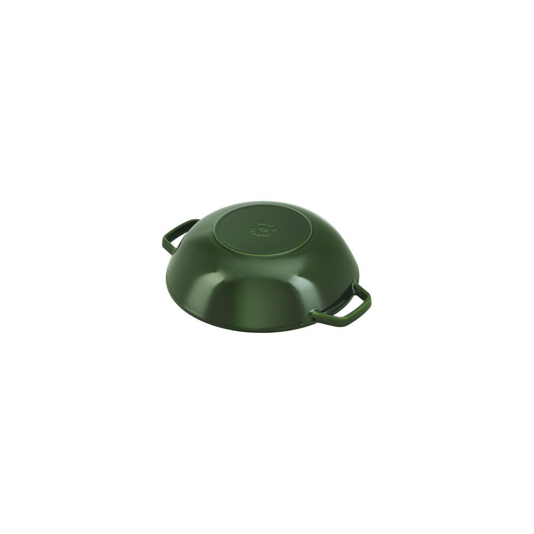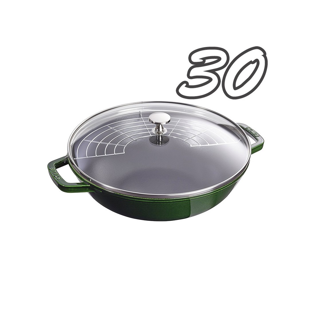 Wok 30 cm in ghisa smaltata Staub in finitura classica nero opaco con con griglia e coperchio in vetro. Ideale per preparazioni ispirate alla cucina asiatica e non solo, è perfetto per stufare, cuocere al vapore e friggere carne, pesce e verdure con risultati sempre uniformi.